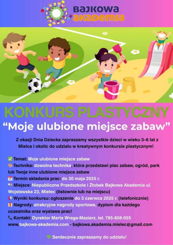Z okazji zbliżającego się Dnia Dziecka , Niepubliczne Przedszkole Bajkowa Akademia serdecznie zaprasza wszystkie dzieci w wieku 3–6 lat z Mielca i okolic do udziału w wyjątkowym konkursie plastycznym pt. „Moje ulubione miejsce zabaw” .